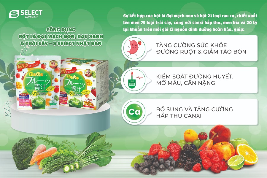 Bột lá đại mạch non, rau xanh và trái cây S Select - Sự kết hợp của bột lá đại mạch non và bột 21 loại rau củ, chiết xuất lên men 75 loại trái cây, cùng với canxi hấp thu, men bia và 20 tỷ lợi khuẩn trên mỗi gói là nguồn dinh dưỡng hoàn hảo giúp: Tăng cường sức khoẻ đường ruột và giảm táo bón; Kiểm soát đường huyết, mỡ máu & cân nặng; Bổ sung và tăng cường hấp thu canxi.