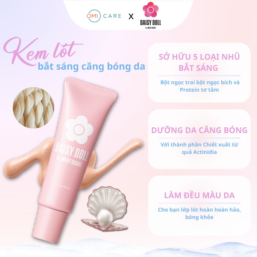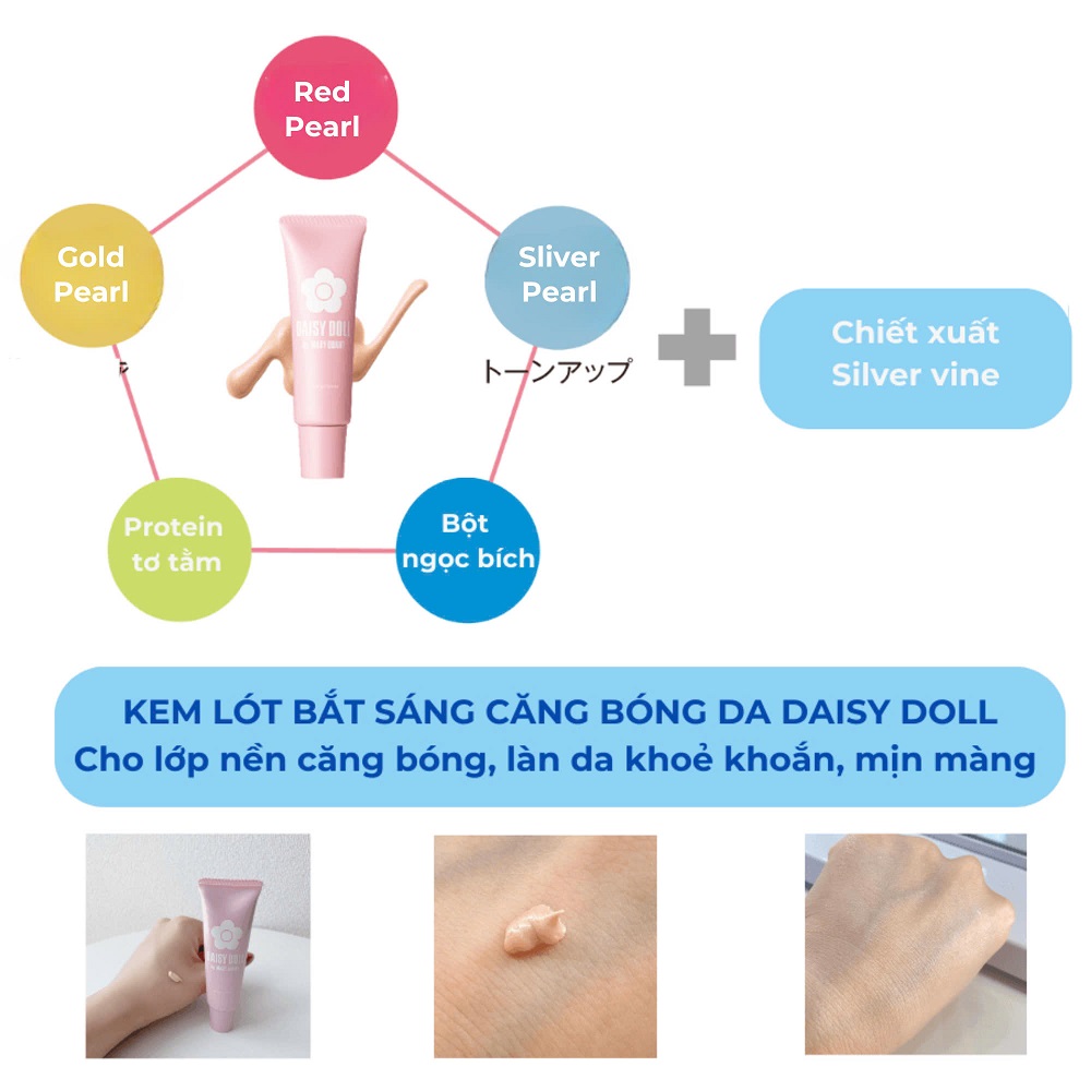Kem lót bắt sáng căng bóng da Daisy Doll tạo hiệu ứng cho làn da căng bóng rạng rỡ, làm mịn lỗ chân lông và làm đều màu da, dưỡng ẩm mềm mịn.