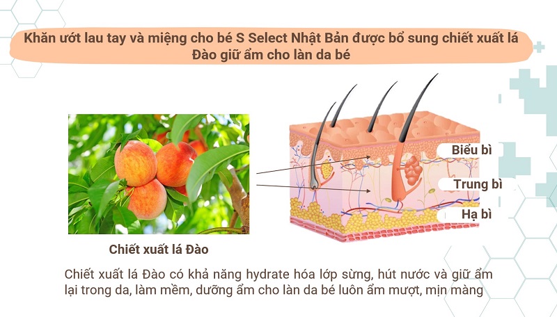 Miếng khăn giấy ướt S Select cho bé được bổ sung chiết xuất lá đào, giúp cân bằng và duy trì độ ẩm tự nhiên trên làn da bé. Mẹ an tâm sử dụng mà không làm khô da của con. Sản phẩm khăn ướt cho bé S Select không chứa cồn, không mùi hương, dịu nhẹ và an toàn với làn da của bé.