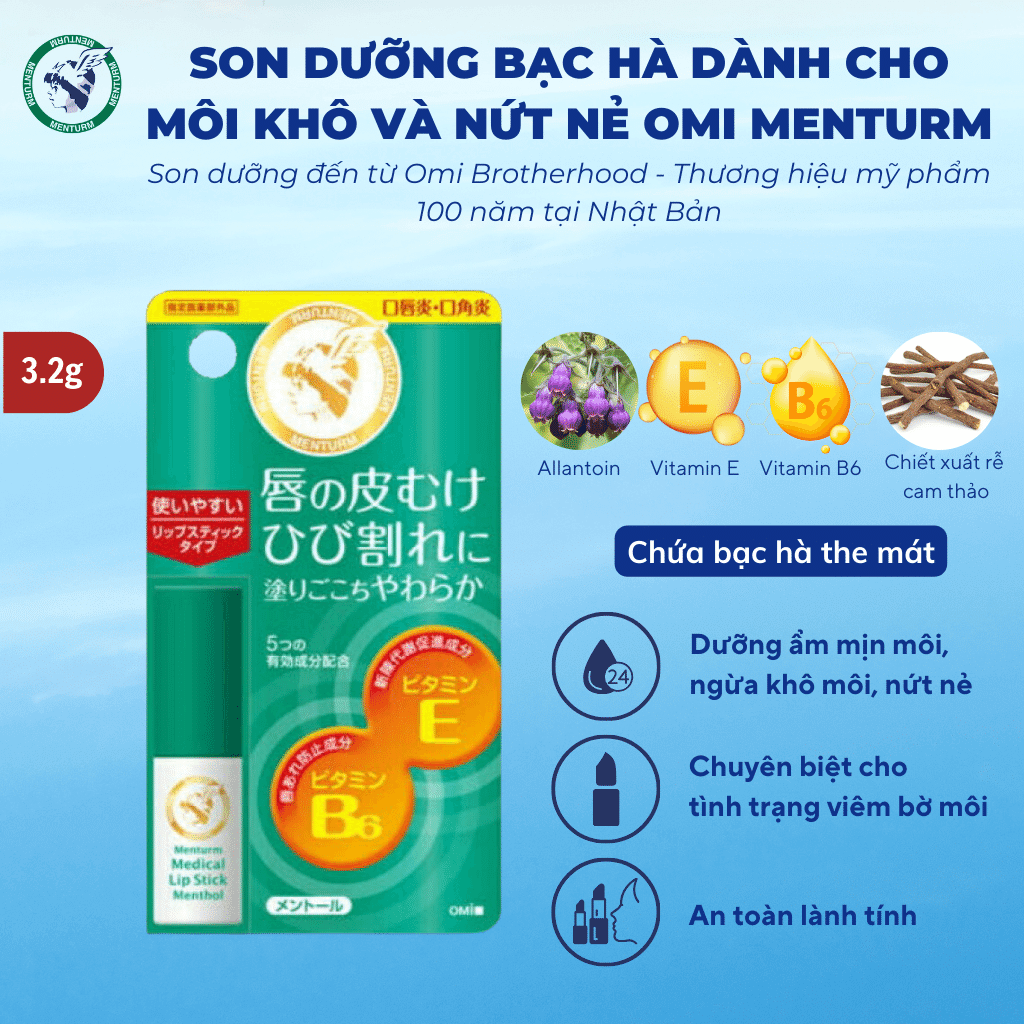 Son dưỡng bạc hà dành cho môi khô và nứt nẻ OMI MENTURM là Son dưỡng môi duy nhất tại Nhật Bản chuyên biệt cho tình trạng viêm bờ môi, khóe môi với công thức dưỡng ẩm và chăm sóc chuyên biệt nhờ kết hợp hoàn hảo từ 4 thành phần: