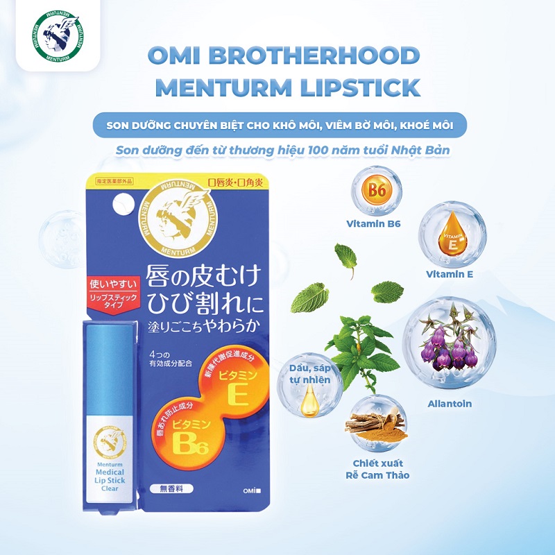 Omi Menturm Lip Stick là dòng son dưỡng nổi tiếng đến từ thương hiệu mỹ phẩm hơn 100 năm tuổi Omi Brotherhood – Nhật Bản, chuyên biệt cho tình trạng môi khô, nứt nẻ, viêm bờ môi và khóe môi. Với công thức dưỡng ẩm sâu, thành phần lành tính và hiệu quả, sản phẩm nhanh chóng làm dịu, phục hồi và bảo vệ đôi môi, đặc biệt phù hợp với khí hậu khô hanh, ô nhiễm.